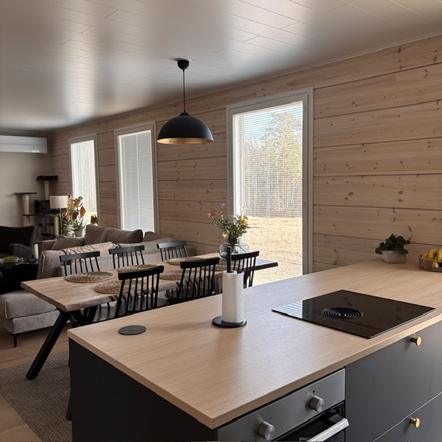 – Hän ei ollut nähnyt tällaista aiemmin. Meiltä kysyttiin, että ei kai tuo keittiö nyt sentään ollut paikoillaan talon tullessa? Hämmästys oli suurta, kun kerroimme, että itse asiassa keittiön lisäksi myös takka, wc-pöntöt ja kiuaskin oli asennettu jo tehtaalla, Heikki kertoo.