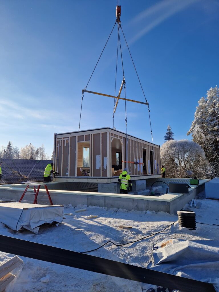 Tammikuussa tontille porattiin maalämpökaivo, ja helmikuun alussa koitti pystytyspäivä. Nopea toimitus mahdollistui monen asian summana: helmikuulta peruuntuneen kaupan vuoksi Kiiruna Talojen tehtaalla oli yksi toimituspaikka vapaana, tontti saatiin nopeasti rakentamiskuntoiseksi ja esimerkiksi liittymät olivat jo valmiina.