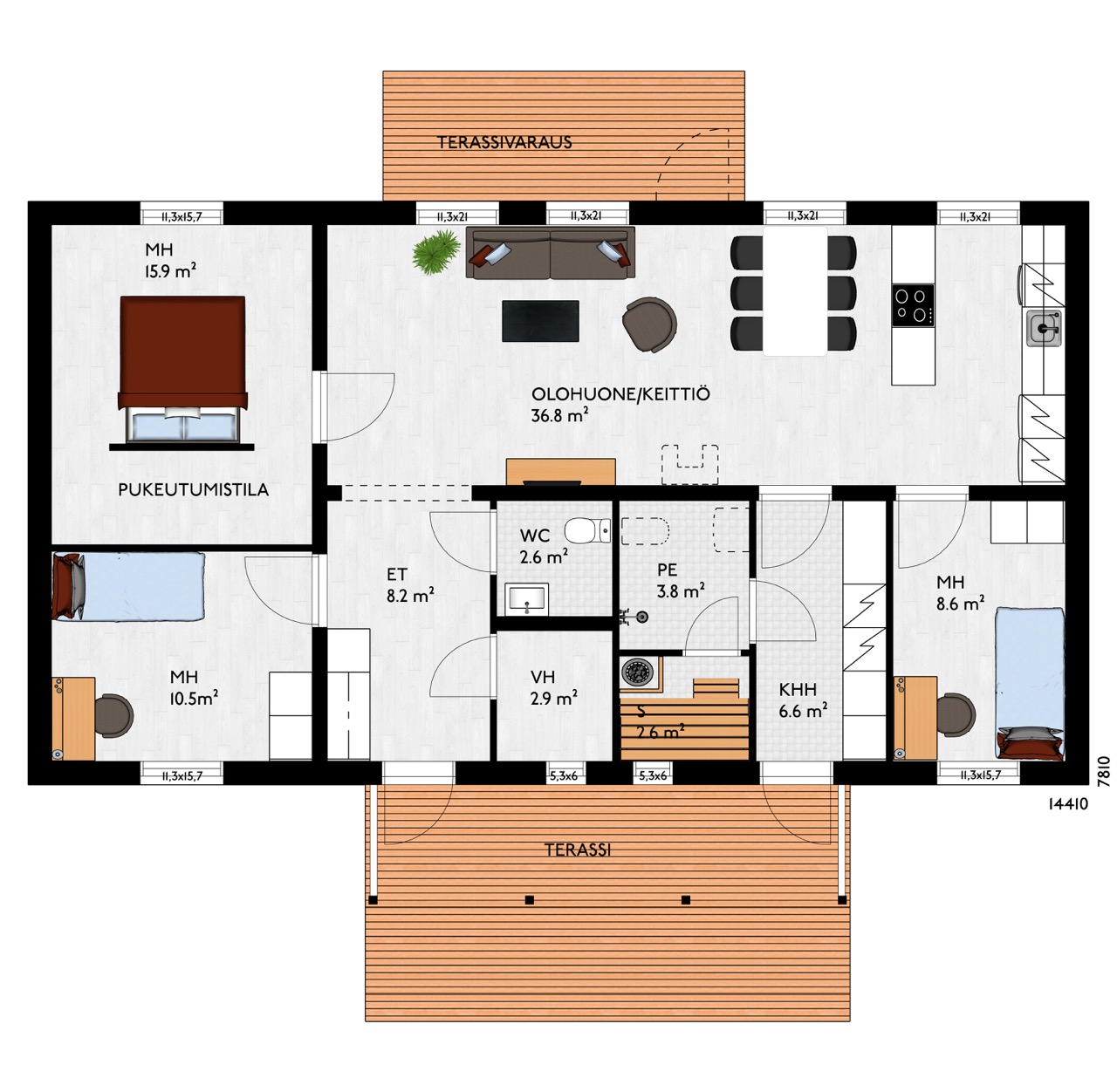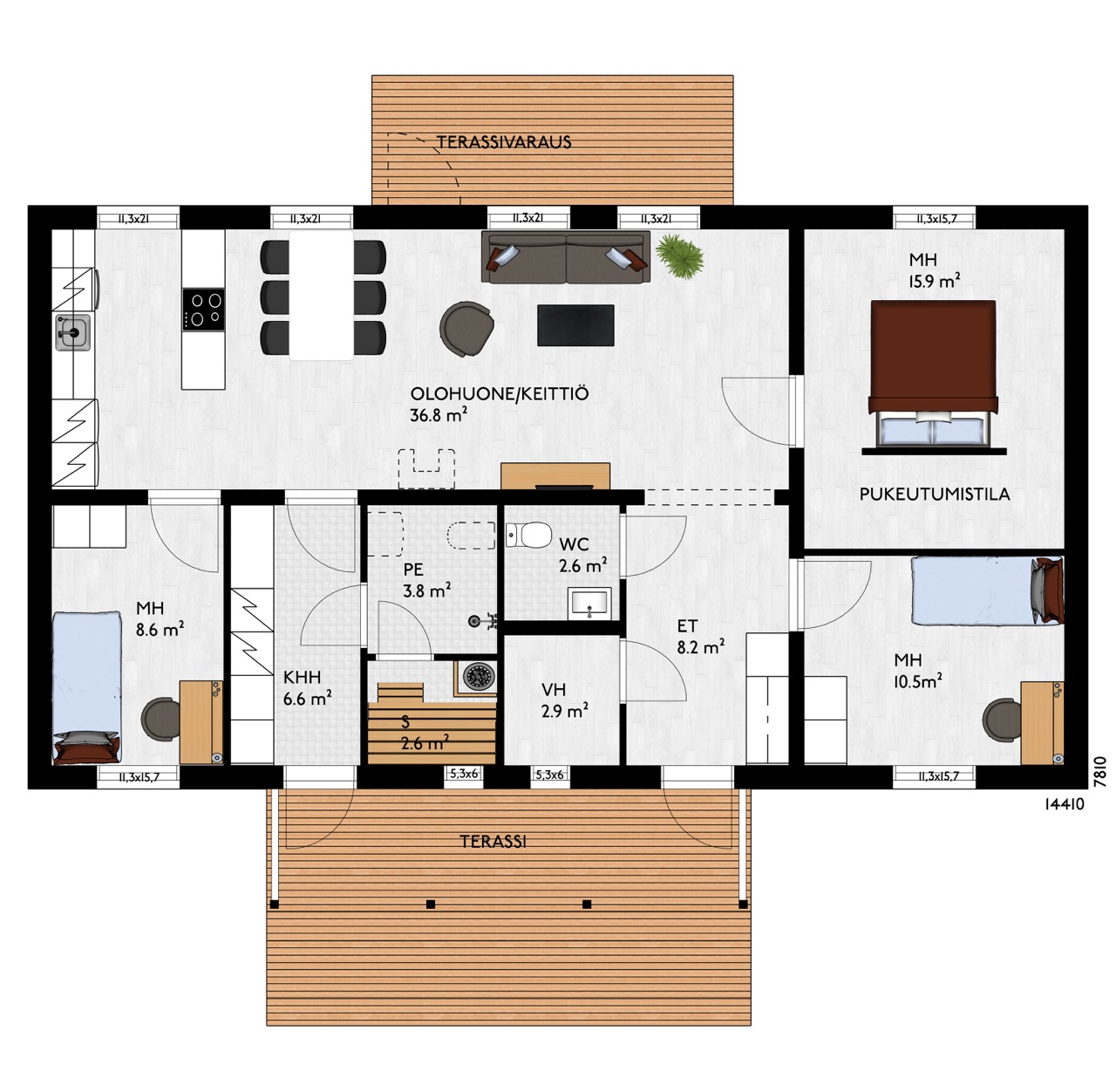 Tässä hirsitalossa on kolme makuuhuonetta ja viihtyisät yleiset tilat. Makuuhuoneista pienin soveltuu erinomaisesti esimerkiksi työhuoneeksi, mikäli kaikille makuuhuoneille ei ole muuten käyttäjiä.