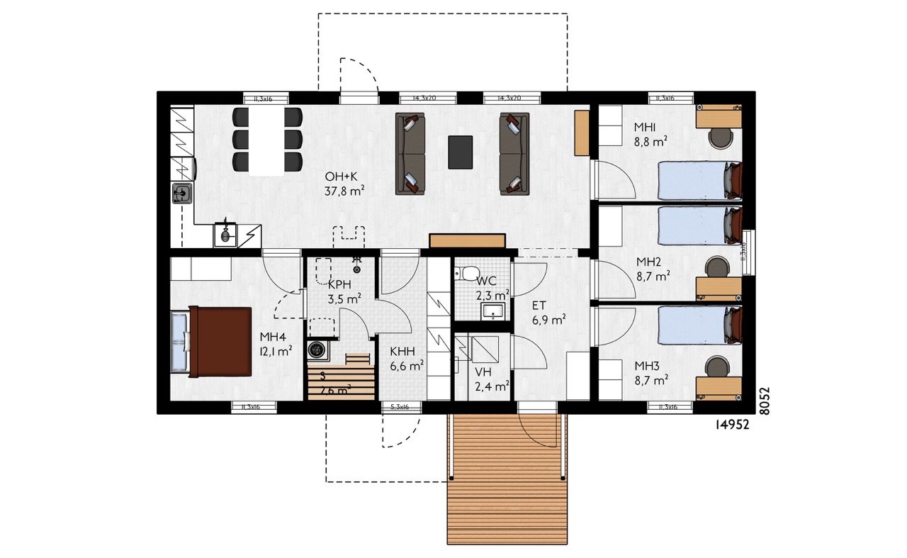 4 MH, OLOHUONE, KEITTIÖ/RUOKAILUTILA, KHH, WC, PH, S, VHH, ET