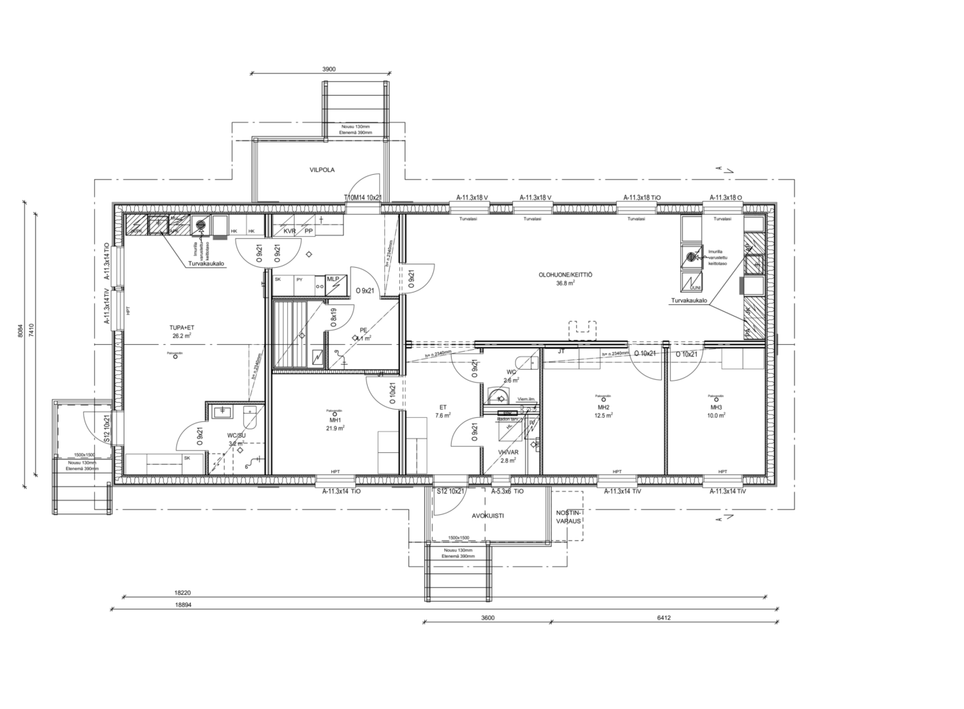 Kolme makuuhuonetta ja tyylikäs olohuone-keittiö saarekkeella tekevät tästä mallista moneen tarpeeseen muuntautuvan kokonaisuuden. Tämän mallin kodinhoitohuone on saanut paljon kiitosta toimivuudestaan.