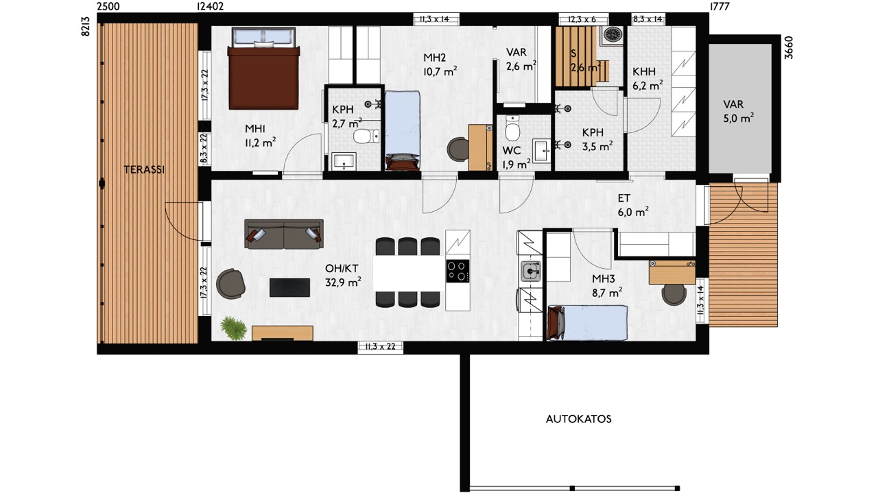 Pohjakuvaan piirretty autokatos sekä kuistin yhteydessä oleva varasto sisältyvät talon perushintaan. Maalämpö asennuksineen kuuluu hintaan.